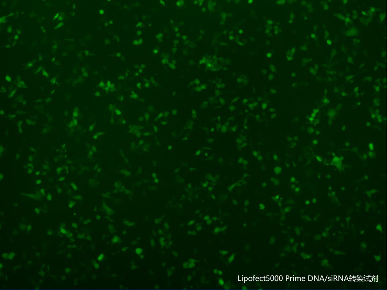 Lipofect5000 Prime 是百代生物海归团队对Lipofect5000质粒DNA转染试剂进行改造优化后的升级产品,其中添加了能够高效转染siRNA/miRNA的构象可变性脂质分子。因而,Lipofect5000 Prime既可高效转染质粒DNA分子,也可高效转染siRNA、miRNA、inhibitor等小分子核酸。Lipofect5000 Prime具有非常强大的转染性能,可将DNA、siRNA、miRNA等高效转染入绝大多数贴壁细胞和悬浮细胞。在部分贴壁细胞中,Lipofect5000 Prime 质粒DNA的转染阳性率可高达90%以上,Fam-siRNA的转染阳性率可高达95%以上。即使对于较难转染的细胞,如神经细胞HT-22、N2A、神经胶质细胞BV2、巨噬细胞Raw264.7、白血病细胞K562、结肠癌细胞HCT116、SW480、胃癌细胞AGS等也有较为显著的转染效果。