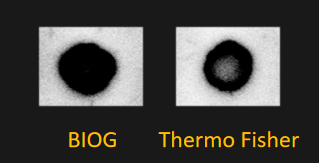 图1.使用BIOG DNA探针末端标记试剂盒和Thermo Fisher DNA探针末端标记试剂盒分别对GAPDH DNA探针进行Biotin标记,斑点杂交实验检测Biotin标记效果。