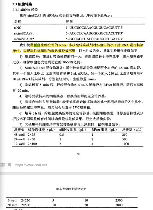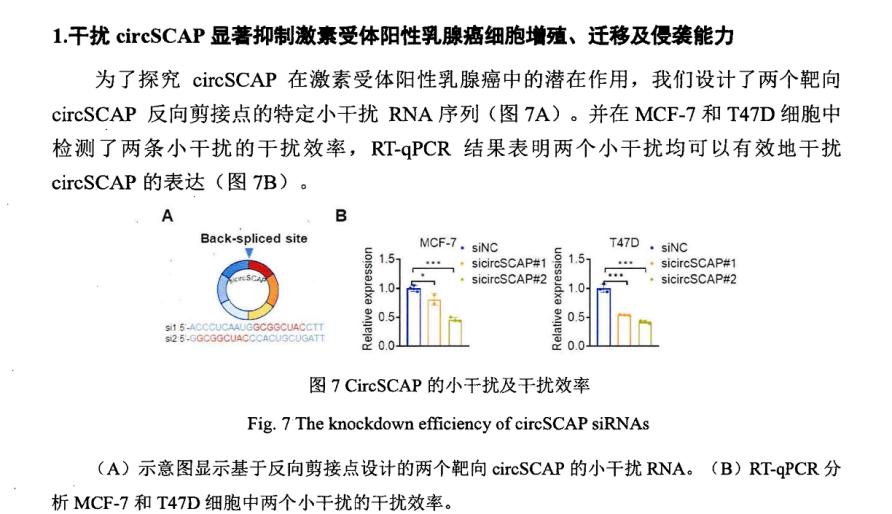山东大学研究者在CircSCAP调控激素受体阳性乳腺癌进展转移的机制研究中,为了探究circSCAP对激素受体阳性乳腺癌细胞生长增殖、迁移侵袭能力的影响,使用RFect小核酸转染试剂将小干扰核酸(sicircSCAP)成功转染至人乳腺癌细胞(MCF-7、T47D)中。通过RT-qPCR检测发现,转染小干扰后,MCF-7和T47D细胞中的circSCAP基因表达水平均被显著敲低60%左右。